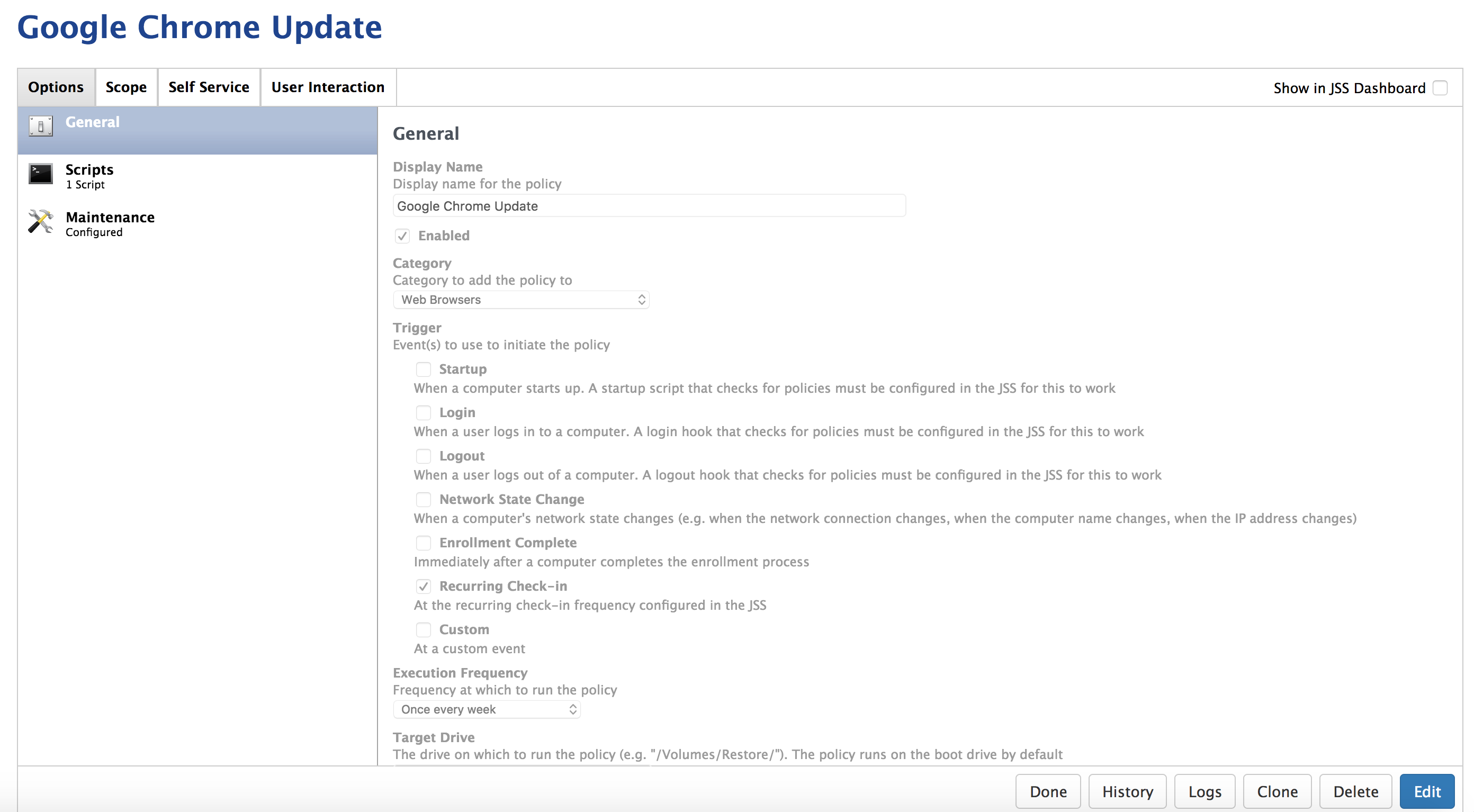 The method we started using at first worked, but needed some manual intervention (See the script here). It downloads and installs the latest Chrome DMG from Google - they have a hidden static URL that always provides the current version. Then we create a Smart Group in Jamf Pro that targets all Macs that have Google Chrome installed where the version is not like insert latest version number. Every time Google update Chrome, we would need to update that version number (which is fairly often) and it’s something my team and I would rather not have to do!